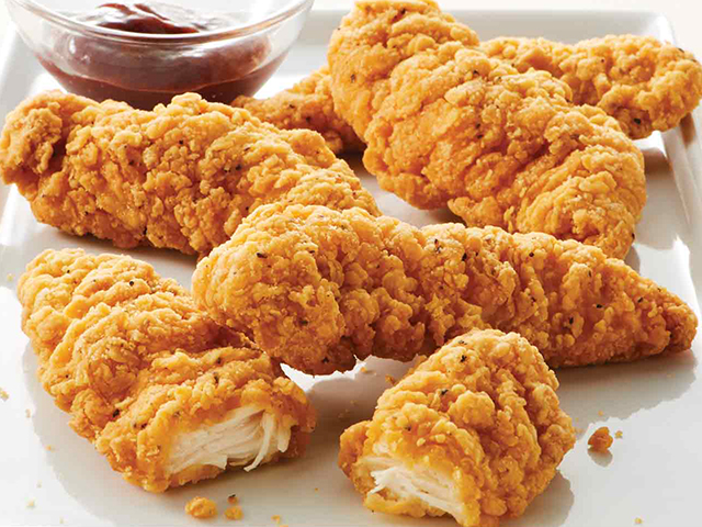 CHICKEN FINGERS all white meat chicken covered in corn flakes.