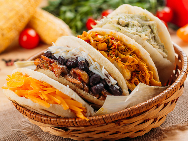 A Venezuelan ICON, ( sandwich made with maize dough, some stuffing’s are: Pernil (Spanish style pork shoulder), chicken stew, black beans and cheese, chicken avocado salad, chorizo, shredded beef, and more